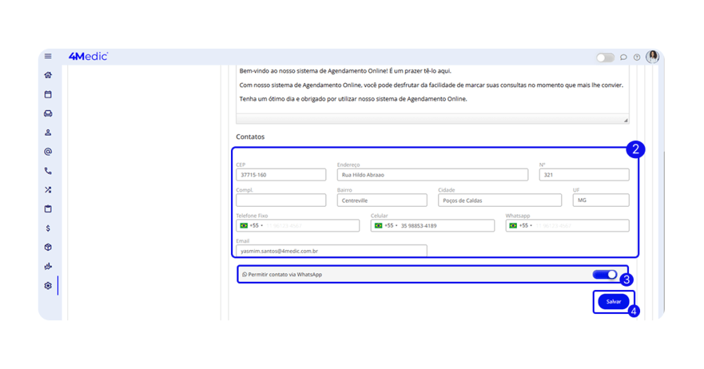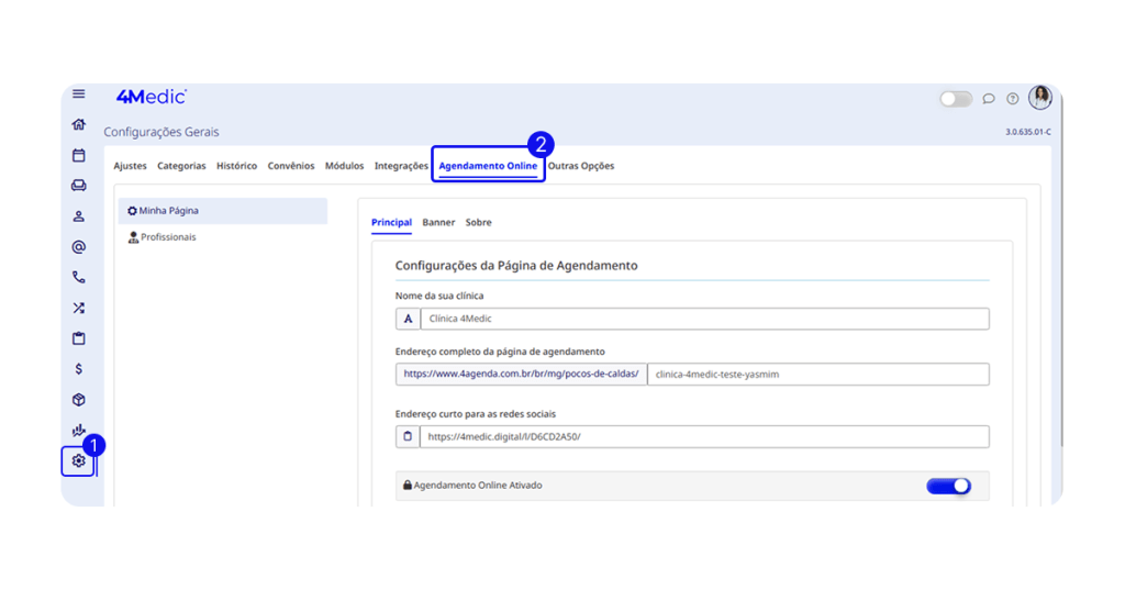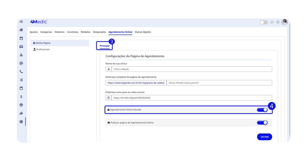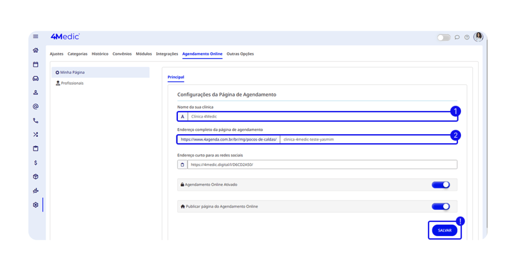 1. Nome da Clínica: insira o nome que será exibido no link de agendamento.