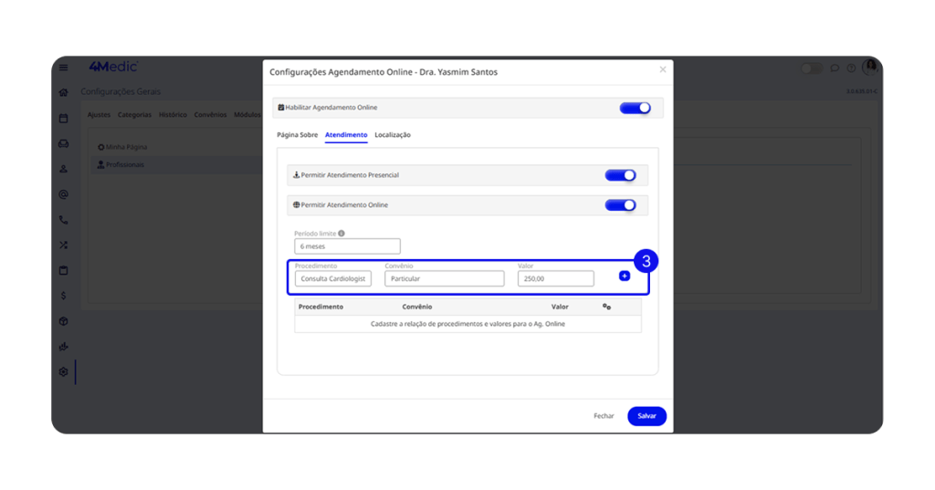 1. Selecione os tipos de atendimento do profissional: Presencial e/ou Online.