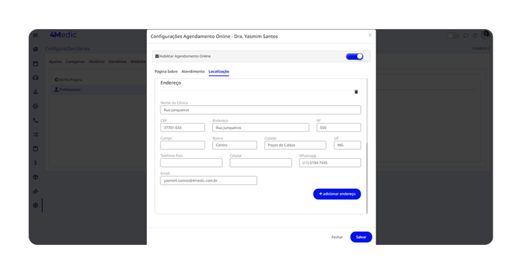 O recurso permite que sua clínica ou consultório ofereça aos pacientes a possibilidade de agendar consultas de forma prática e segura, diretamente pela internet. Com essa funcionalidade, é possível compartilhar o link da agenda em redes sociais, sites ou via WhatsApp, facilitando o acesso e otimizando o fluxo de agendamentos.
