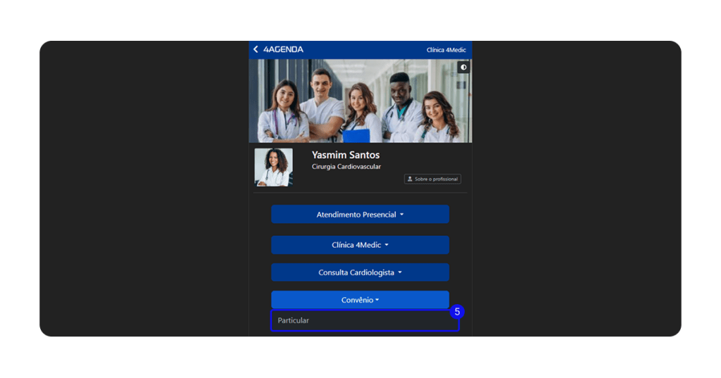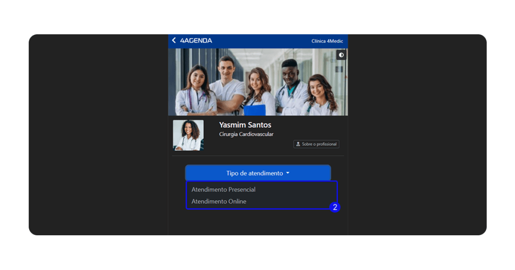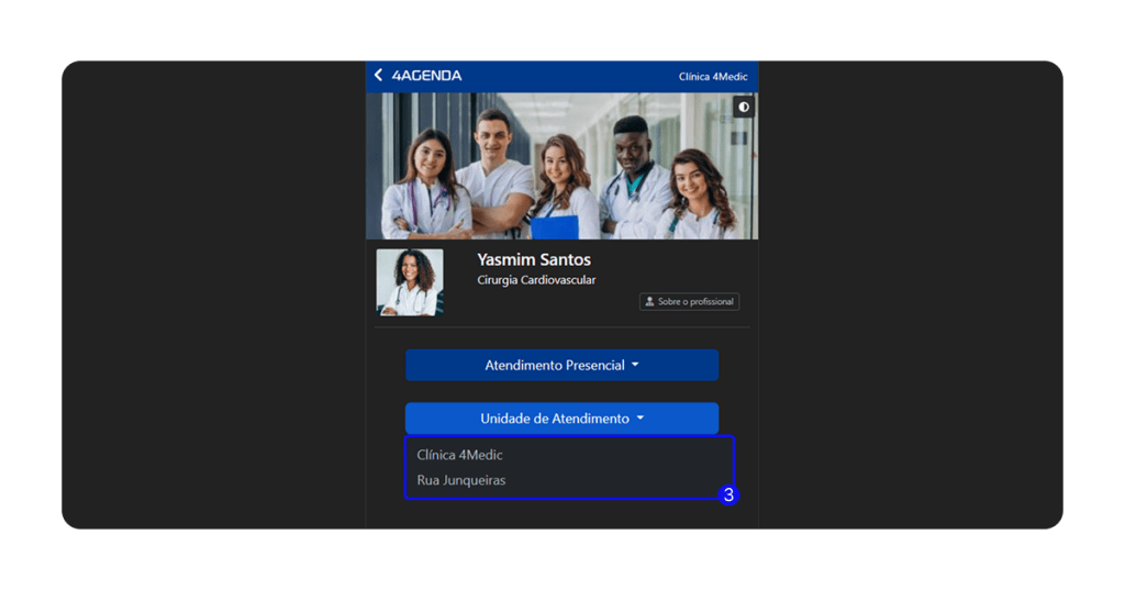3. Escolha a Unidade de Atendimento: clinica ou consultório (caso o profissional atue em mais de um lugar).