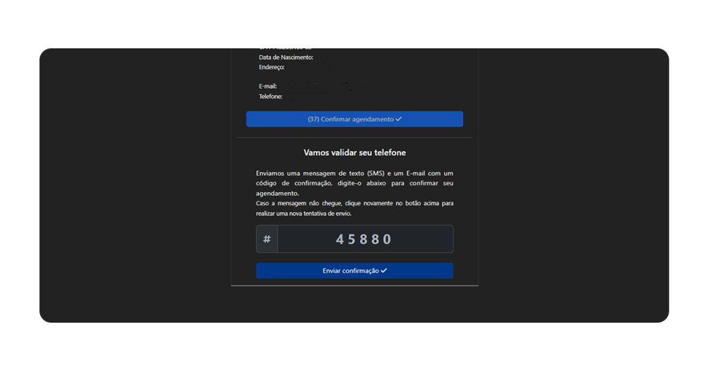 8. Em seguida, clique em confirmar agendamento e irá receber o código de confirmação por SMS e e-mail para verificação.