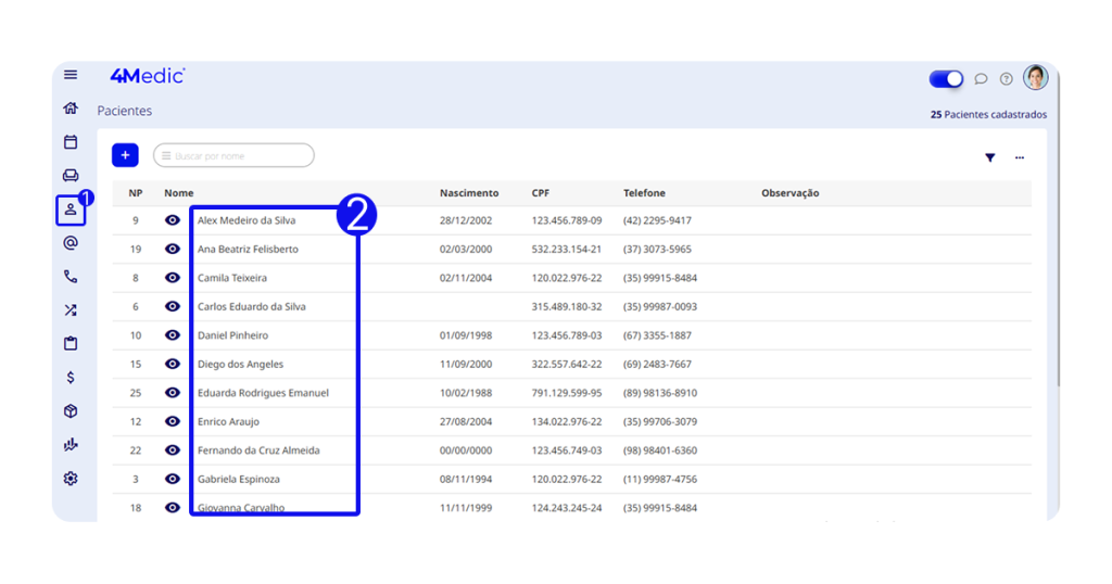 1. No menu lateral esquerdo, clique em Pacientes (ícone de pessoas).