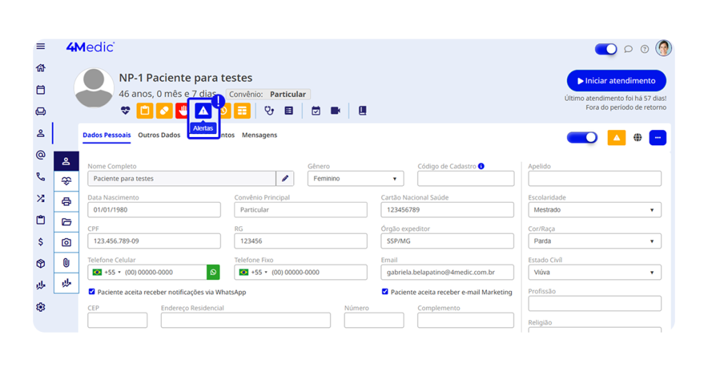 3. Com o prontuário do paciente aberto, clique no ícone de alerta ⚠️, referente ao campo de alertas.