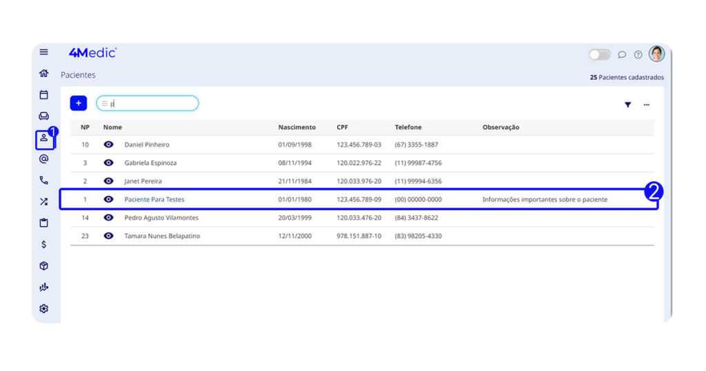 - Localize o paciente desejado e clique sobre o nome para abrir o prontuário eletrônico.
