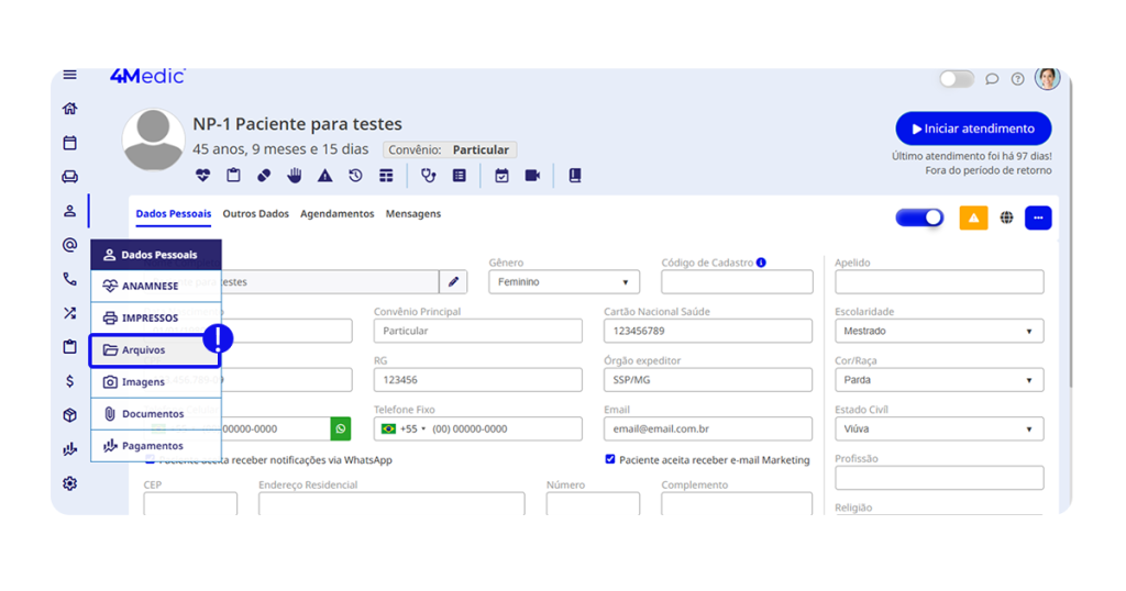 - Com o prontuário aberto, acesse a aba Arquivos no menu lateral esquerdo.