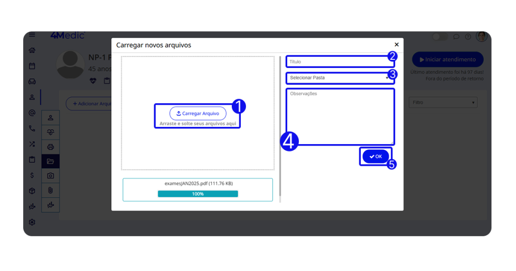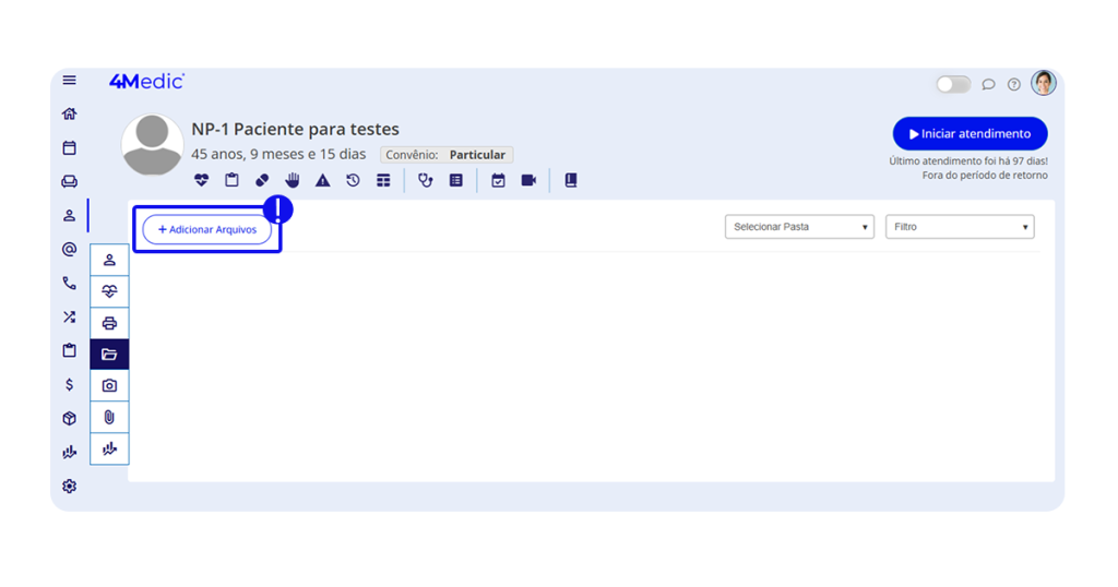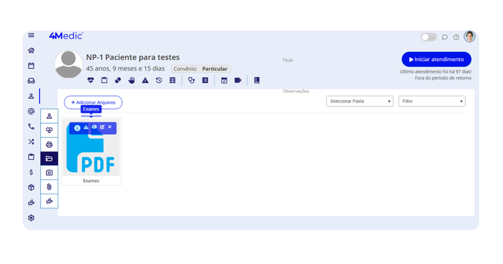 Neste tutorial, você aprenderá a salvar e arquivar imagens e arquivos clínicos diretamente no prontuário do paciente, além de criar, editar e excluir pastas de forma simples e organizada.