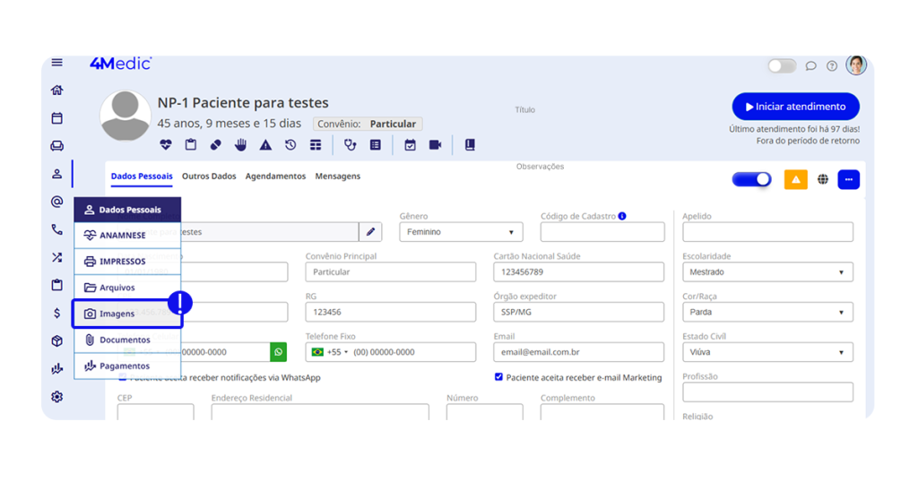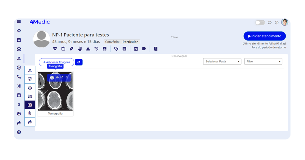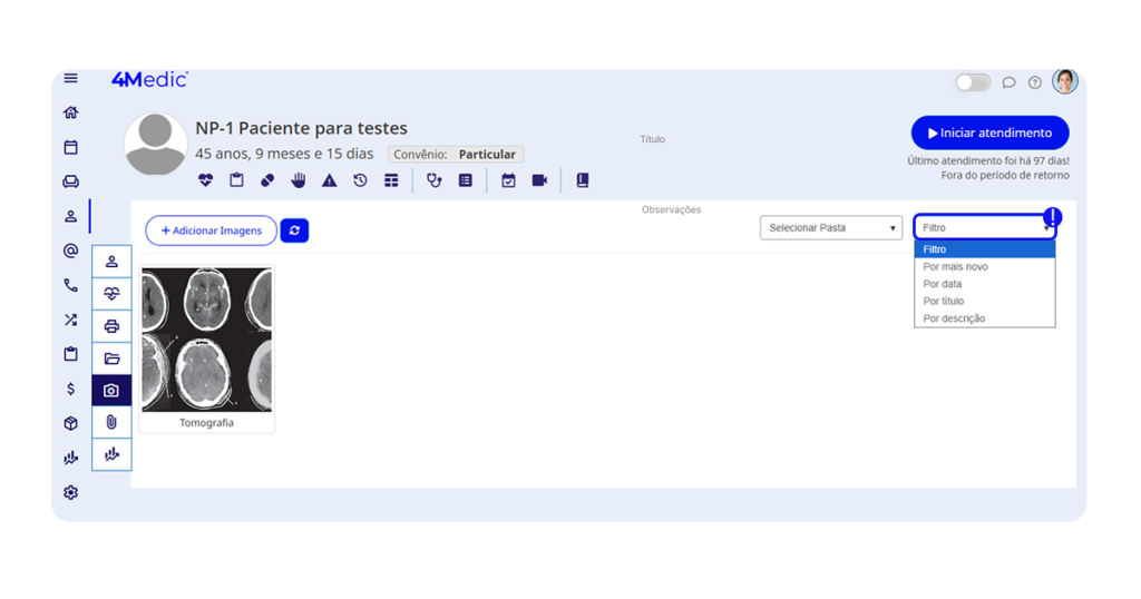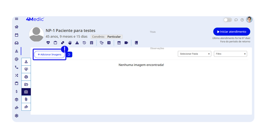 - Com o prontuário aberto, acesse a aba Imagens no menu lateral esquerdo.