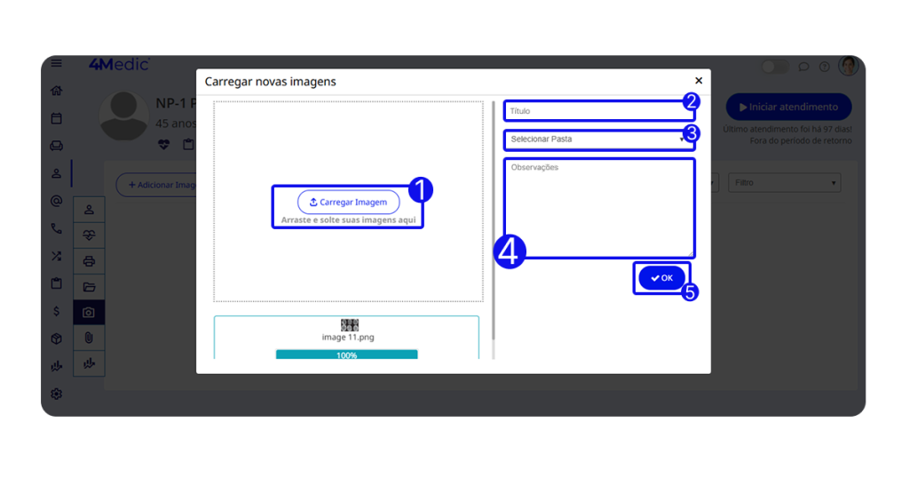 Com esse processo simples, você consegue organizar, arquivar e gerenciar imagens e documentos clínicos com agilidade, mantendo o prontuário eletrônico completo e seguro. Sempre que necessário, repita esses passos para manter o histórico atualizado e bem estruturado.