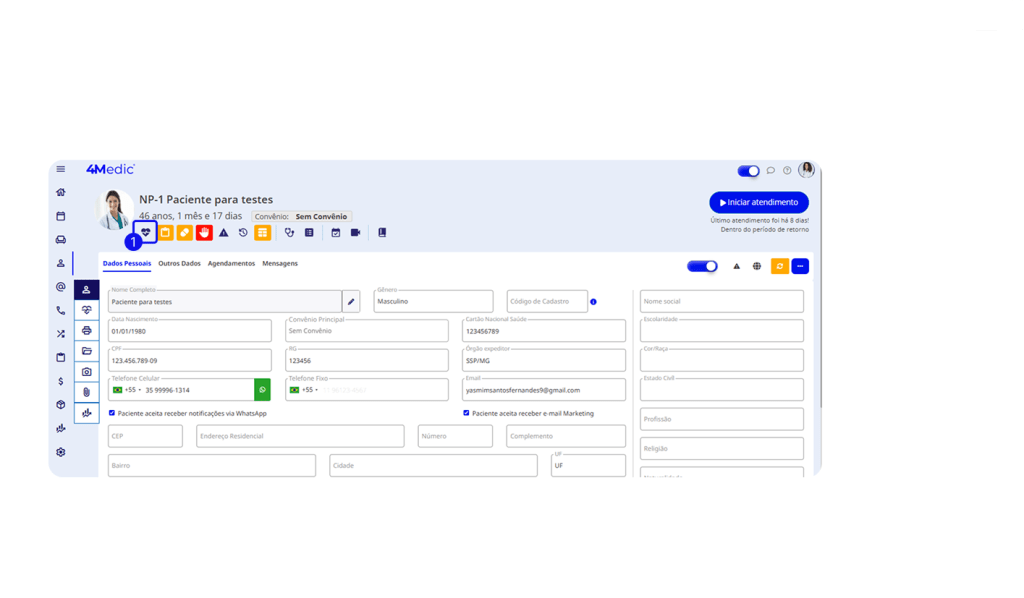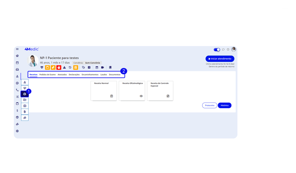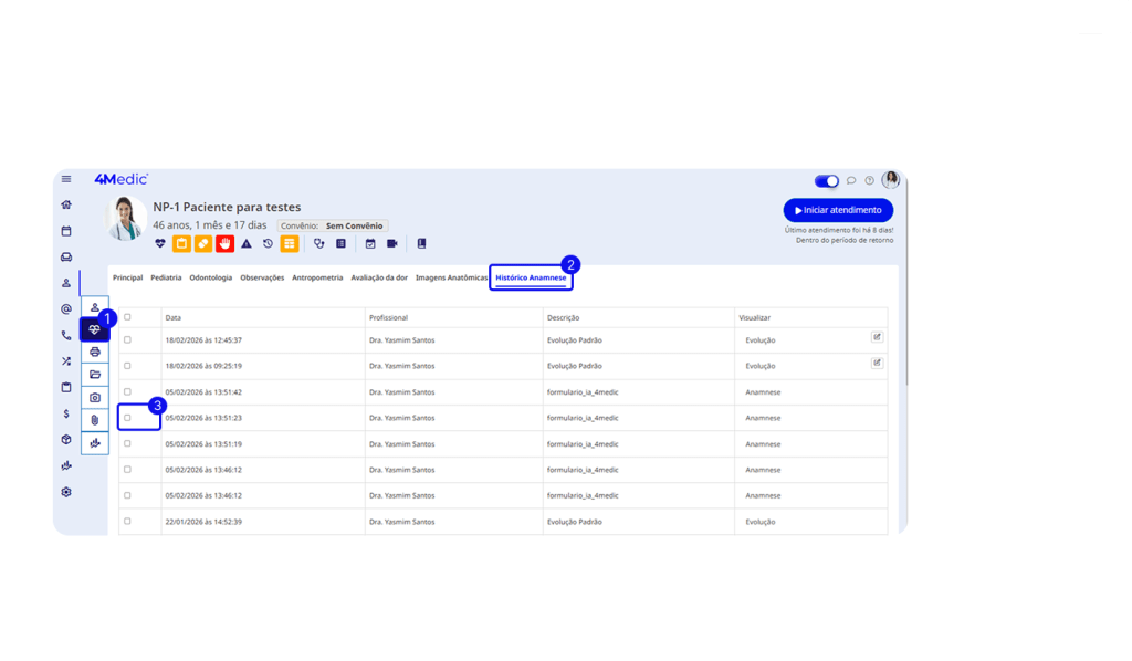 1. Com o prontuário do paciente aberto, localize o menu abaixo do nome do paciente e clique em História Clínica (ícone de coração ❤️).