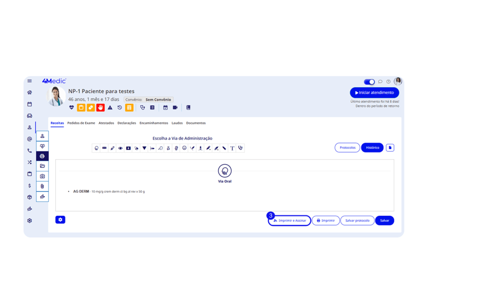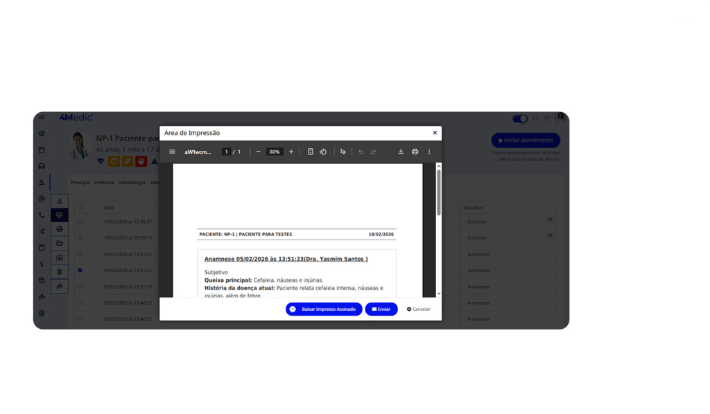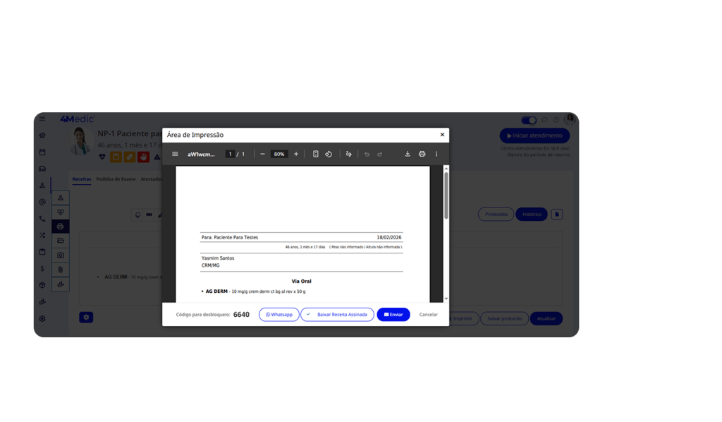 Pronto! O impresso será gerado com a assinatura digital e poderá ser impresso ou enviado online por e-mail, Sms ou WhatsApp ao paciente.