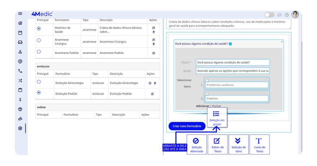 Observação: As opções Caixa de Texto e Editor de Texto não possuem alternativas de resposta, pois o paciente responderá por digitação livre.