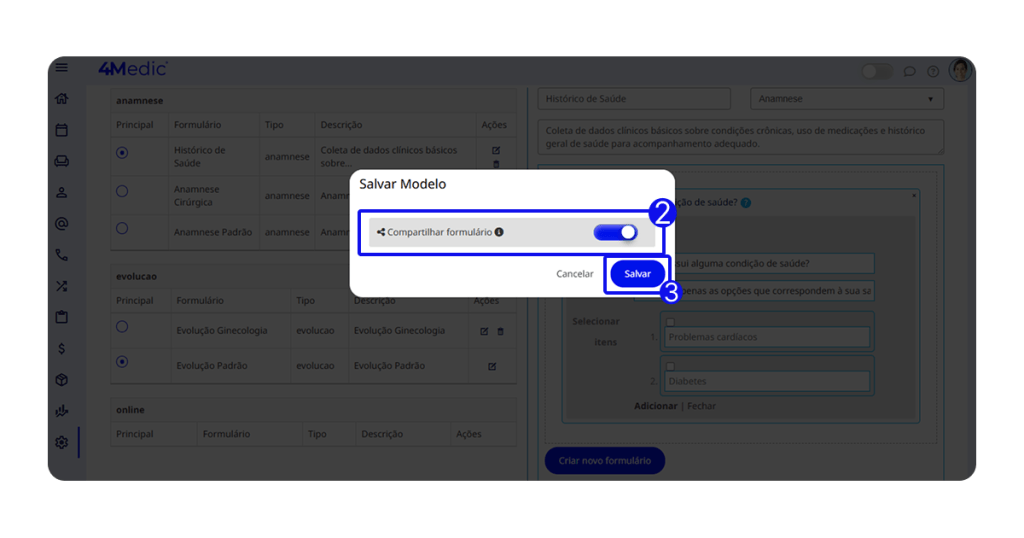 2. Caso deseje compartilhar o modelo com outros profissionais, ative a chave de compartilhamento.