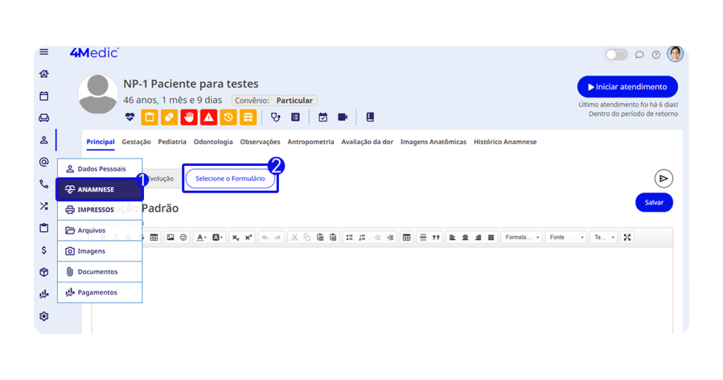 1. Entre no perfil do paciente e vá em “Anamnese”.
