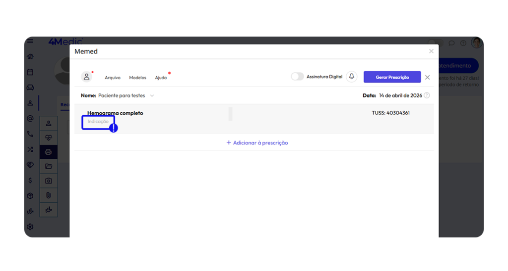 • Ao selecionar determinados tipos de modelo (como, por exemplo, exames), utilize o campo Indicação para inserir observações adicionais, caso necessário.