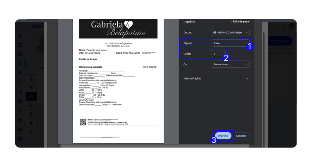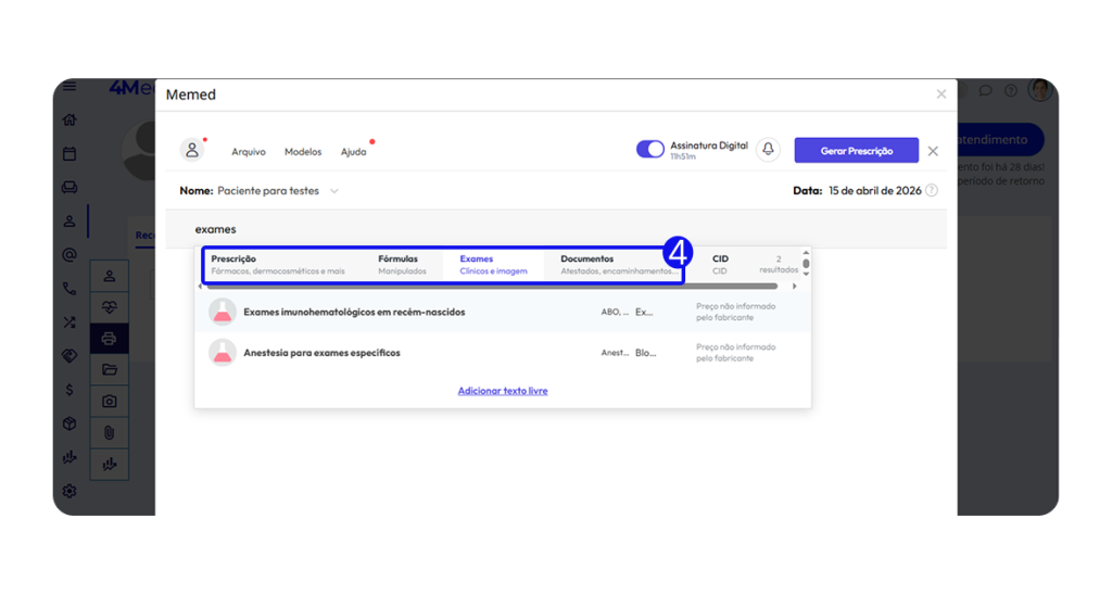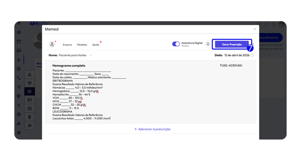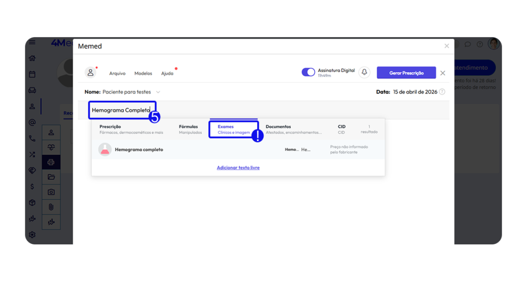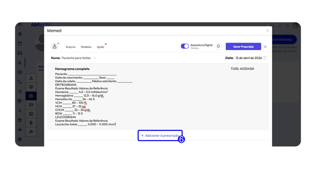 6. Se necessário, clique em adicionar à prescrição para adicionar mais informações/exames ao documento.