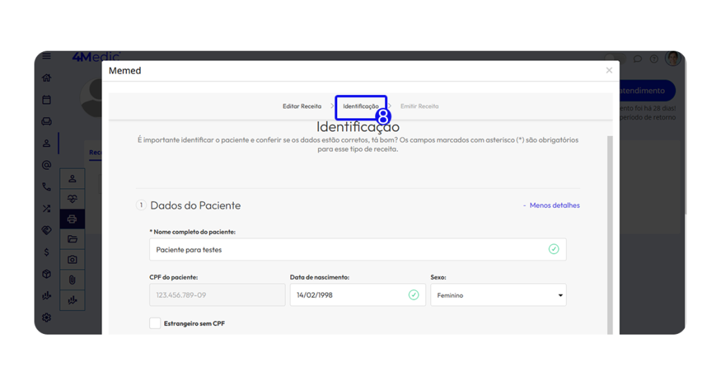 8. Em Identificação confirme os dados do paciente.