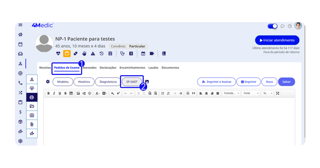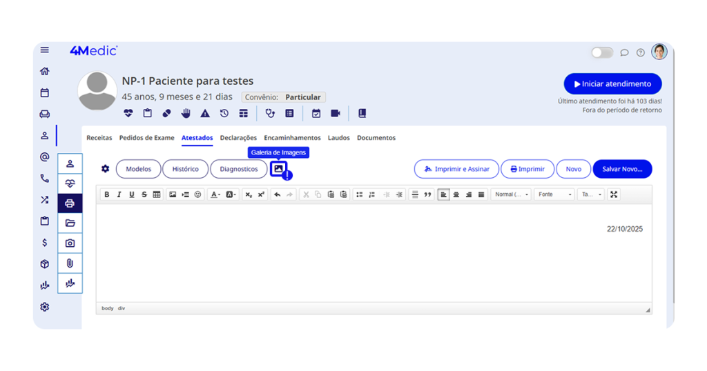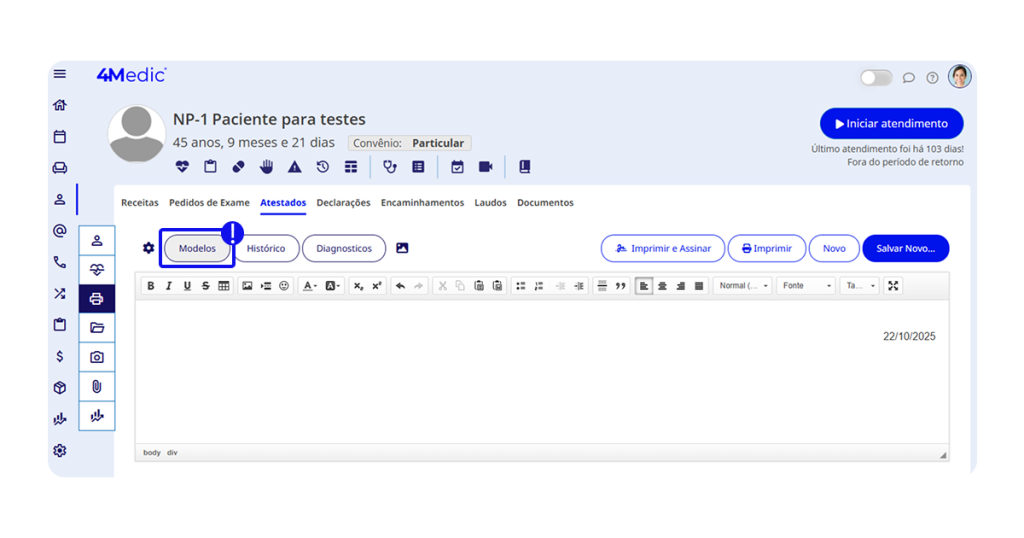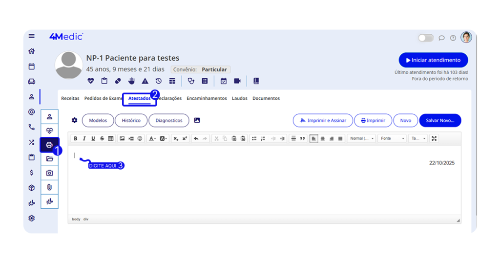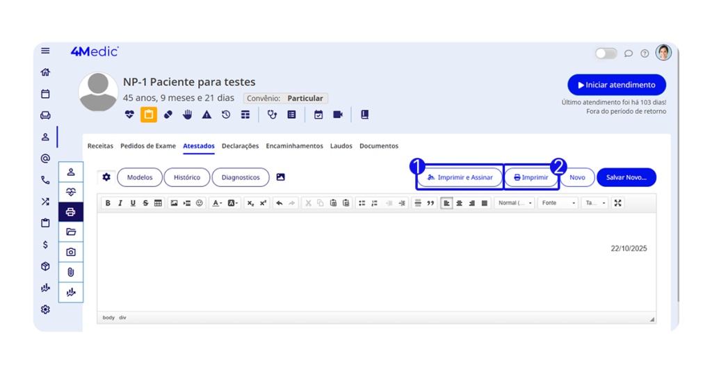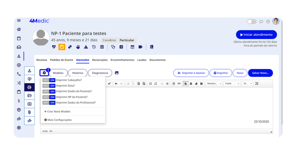 Neste tutorial, você aprenderá a gerar impressos clínicos, como pedidos de exame, atestados, declarações, encaminhamentos, laudos e documentos, além de guias SP-SADT. Também verá como imprimir, assinar digitalmente e enviar online para seus pacientes — otimizando o seu dia a dia na clínica.