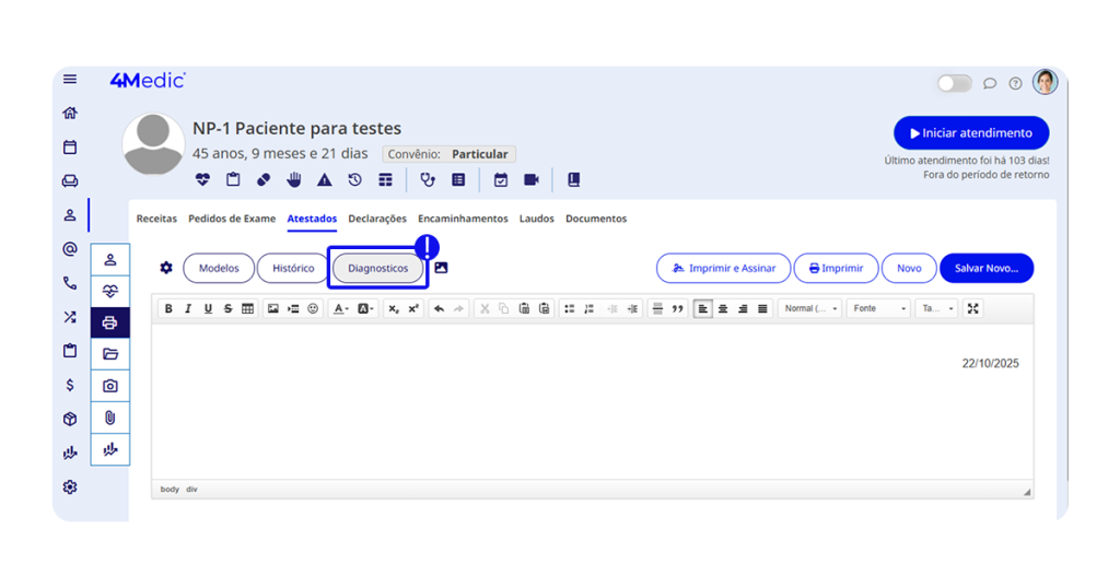 - Para adicionar um diagnóstico do paciente no documento clínico, clique no campo Diagnóstico e no ícone de setinha.