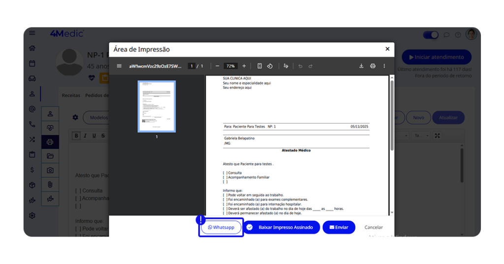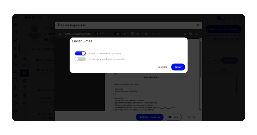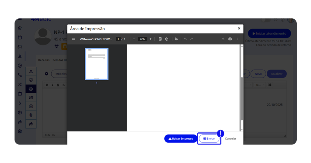 - Após clicar em Imprimir o documento, clique em Enviar para enviá-lo diretamente ao e-mail do paciente.