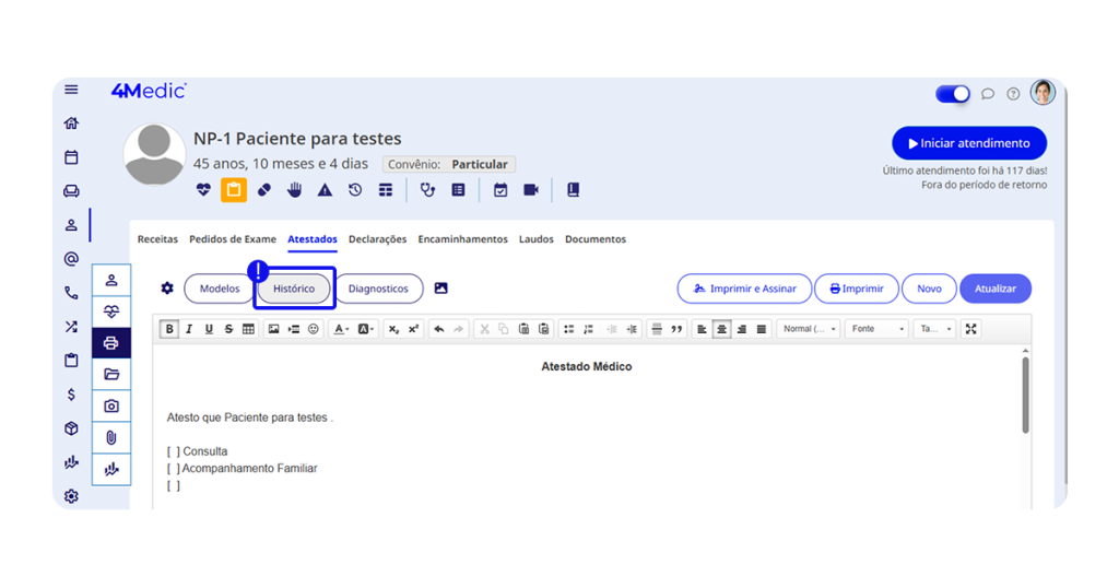 - Na parte superior da tela, selecione o tipo de documento que deseja gerar (exemplo: Atestado).