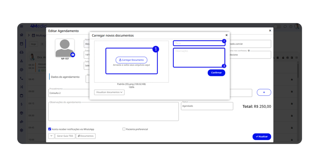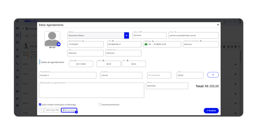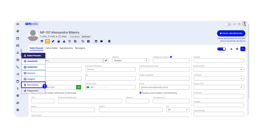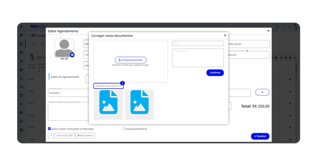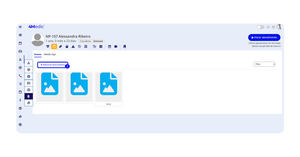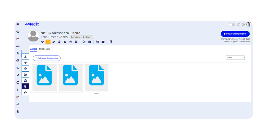 Aprenda a organizar, gerenciar e anexar documentos administrativos do paciente diretamente pela agenda, sala de espera ou prontuário eletrônico. Neste tutorial, você verá como utilizar a aba Documentos, criada para armazenar arquivos administrativos, como comprovantes de pagamento PIX, guias de convênio, comprovantes de endereço, senhas ou outros documentos tragos pelo paciente.