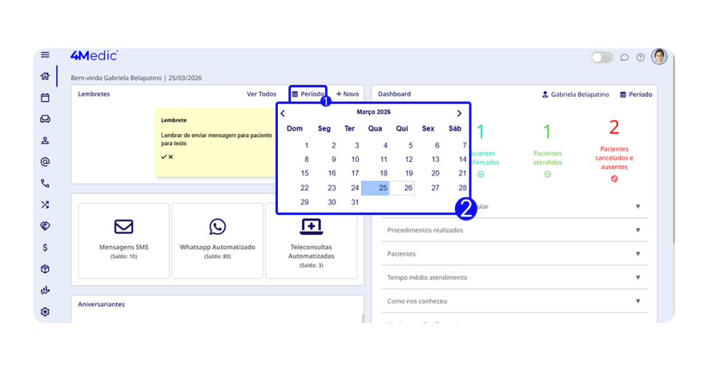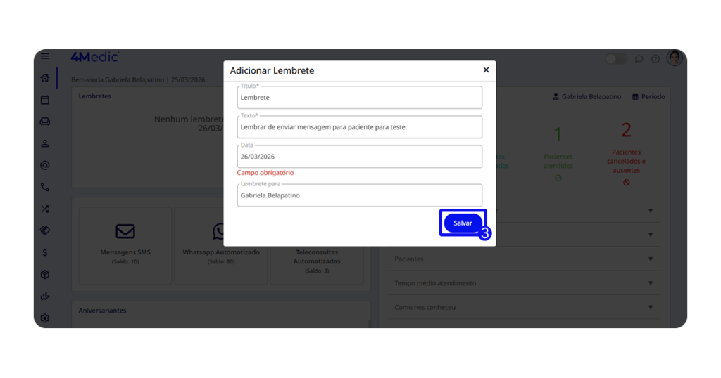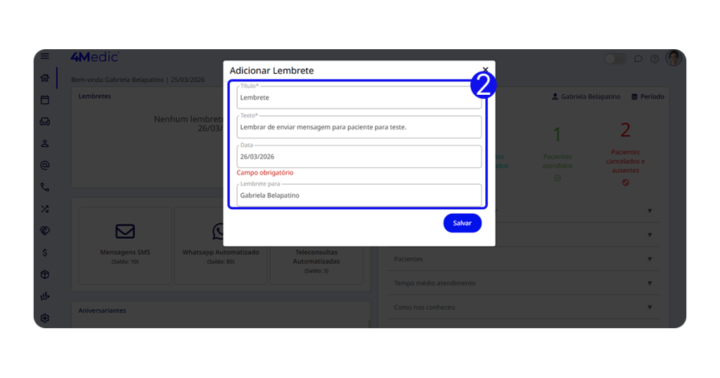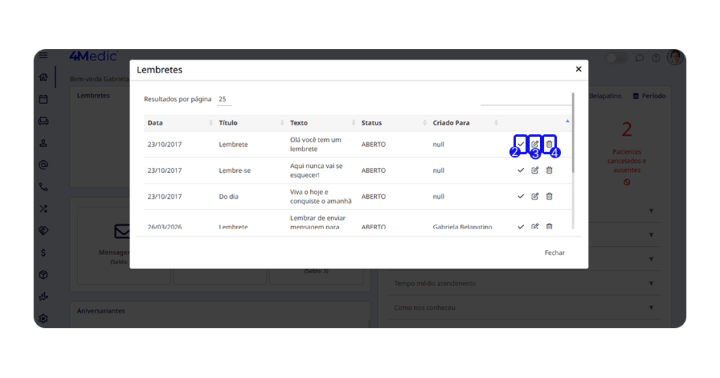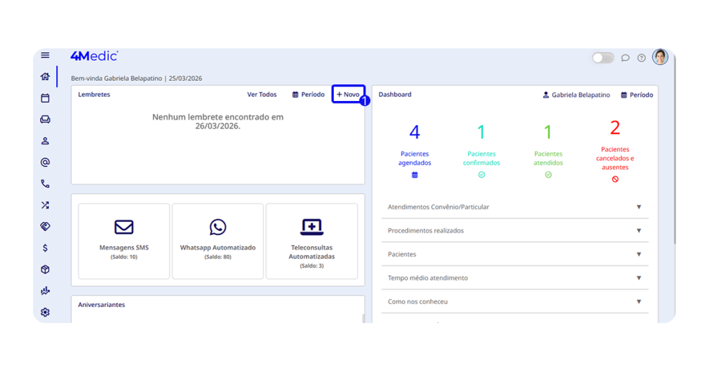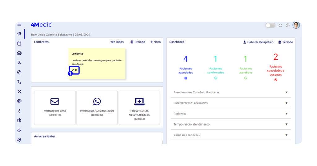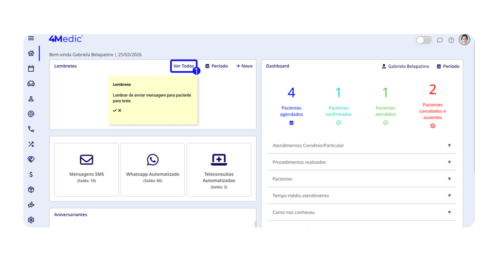💡 Dica: Utilize os lembretes como um organizador de tarefas: acompanhe orçamentos em aberto, agendamentos, ligações e retornos. Aproveite também para tarefas administrativas da equipe. Assim, você mantém o controle da operação, fortalece o relacionamento com o paciente e evita falhas no dia a dia.