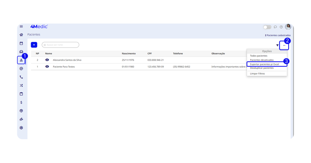 1. No menu lateral esquerdo, clique em Pacientes (ícone de pessoas).