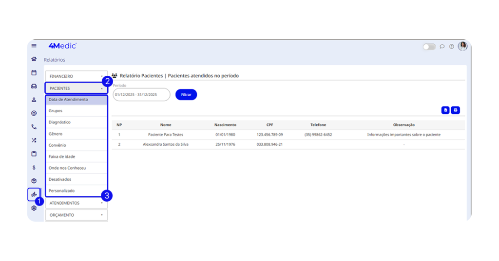 3. Dentro da categoria Pacientes, é possível emitir relatórios como: