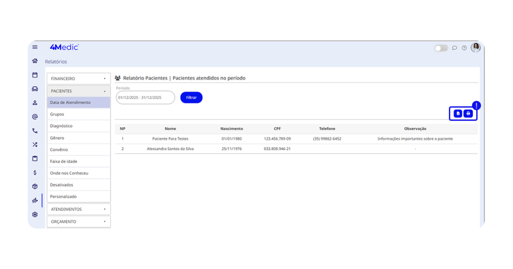 3. Imprimindo e exportando pacientes pela aba Relatórios