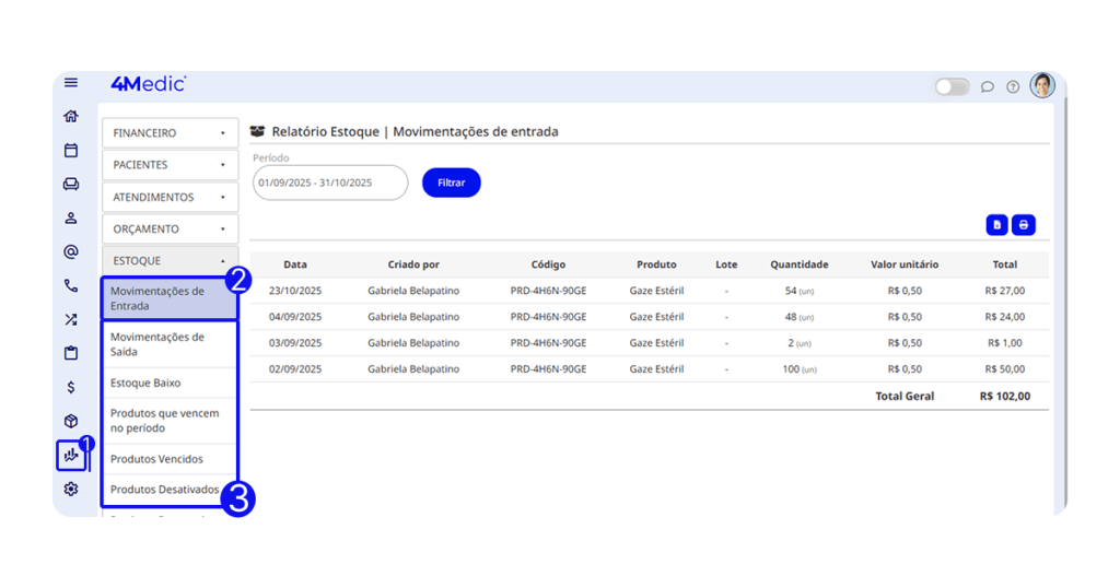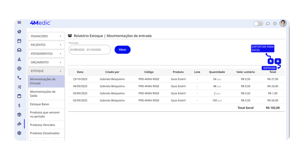Com esse processo simples, você consegue acompanhar o estoque da clínica, analisar movimentações e exportar relatórios para conferência e gestão mais eficiente. Sempre que necessário, repita esses passos e mantenha o controle dos seus produtos atualizado.