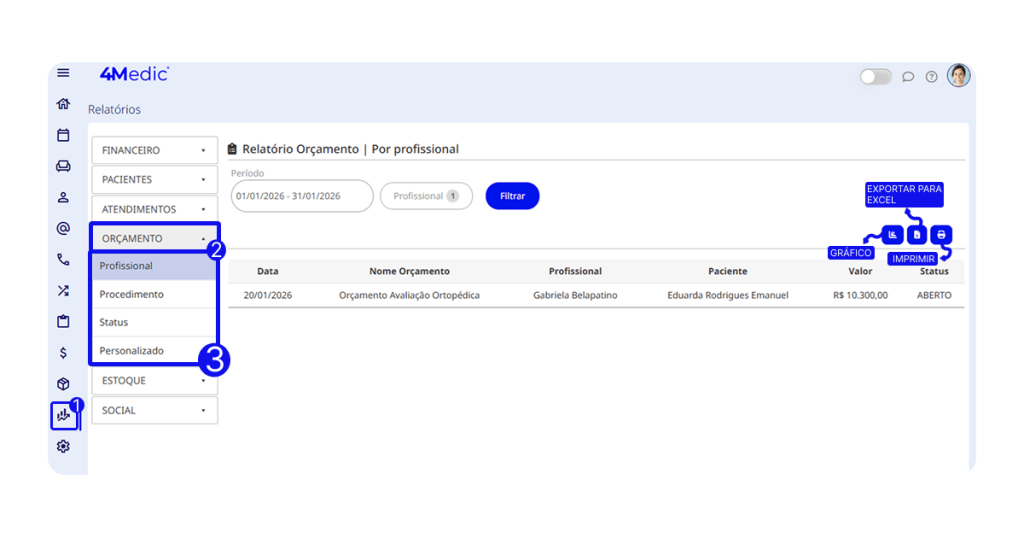 Neste tutorial, você aprenderá como imprimir e exportar relatórios de orçamentos, tanto diretamente pela aba Orçamento quanto pela aba Relatórios, facilitando a análise financeira e o acompanhamento dos dados da clínica.