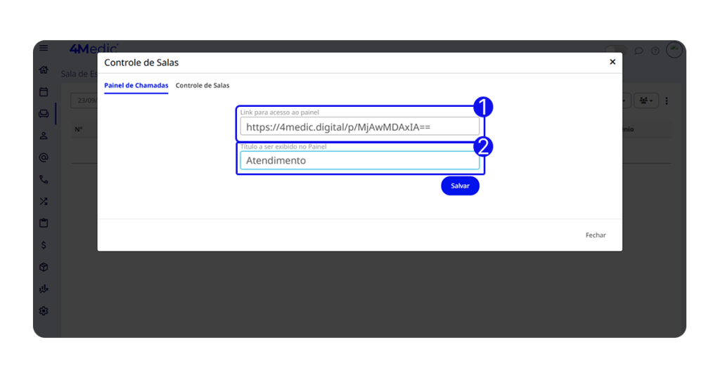 Para oferecer mais praticidade e organização no atendimento, o sistema conta com o recurso de Painel de Chamadas e Controle de Salas. Essa funcionalidade permite exibir, em uma tela na sala de espera, o nome do paciente e a sala onde deverá ser atendido, otimizando a comunicação e tornando a rotina da recepção mais eficiente. A seguir, explicamos como configurar e utilizar esse recurso: