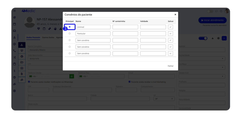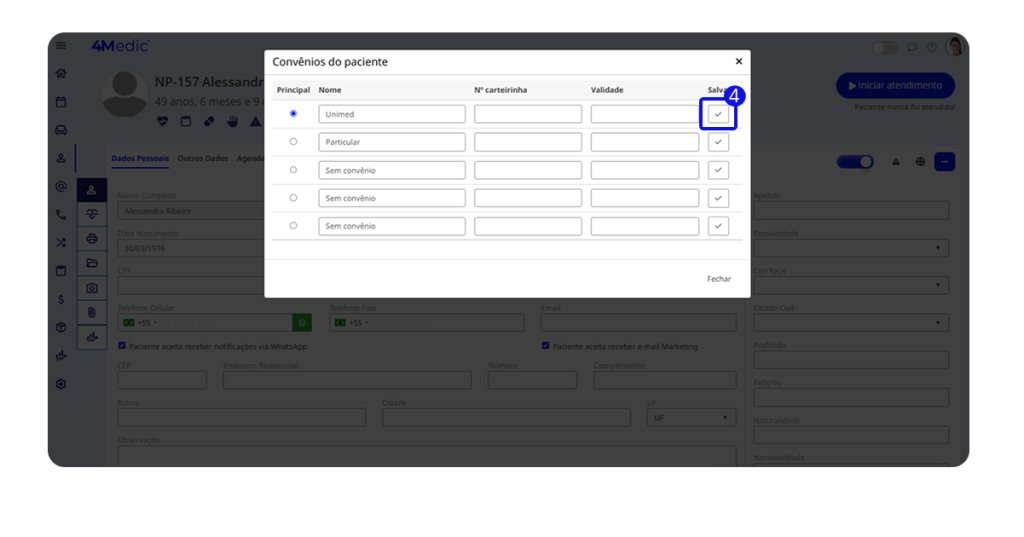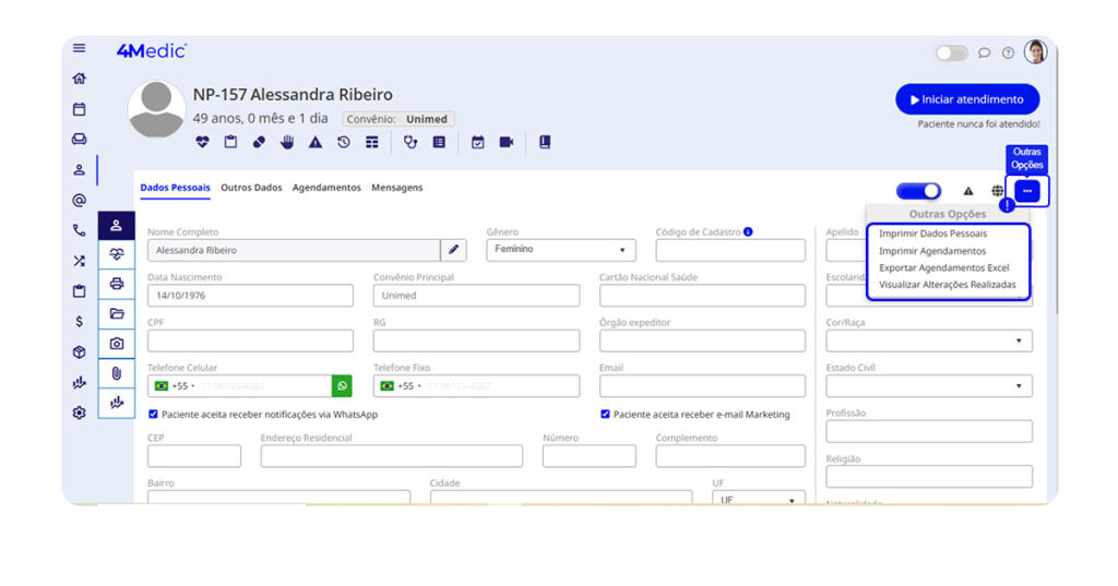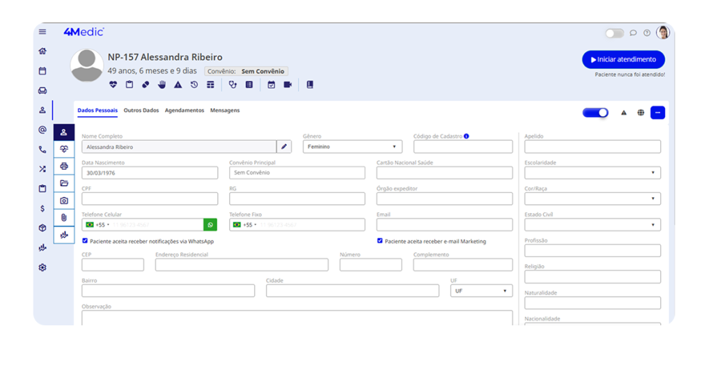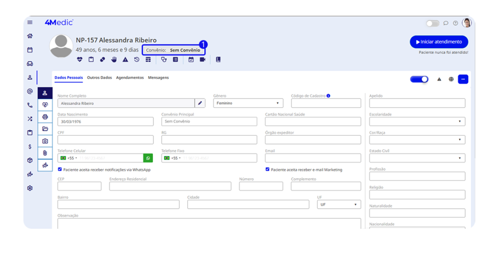 💡 Dica importante: selecione as opções “Paciente aceita receber notificações via WhatsApp” e “Paciente aceita receber e-mail marketing”, caso a clínica utilize esses canais de comunicação.