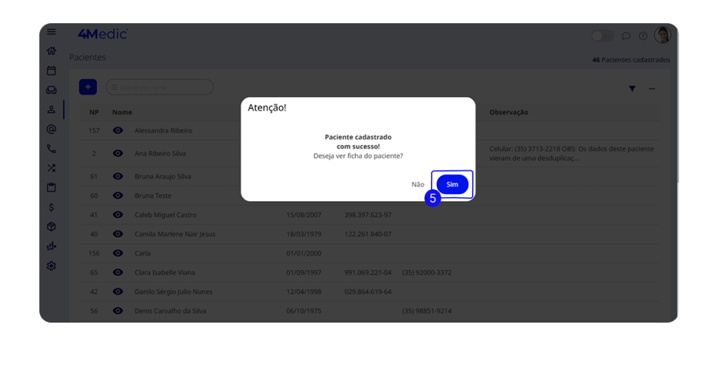 5. O sistema exibirá a mensagem: “Paciente cadastrado com sucesso. Deseja ver a ficha do paciente?”